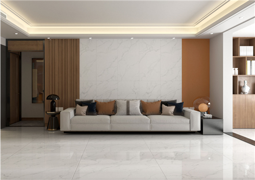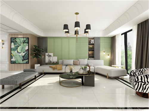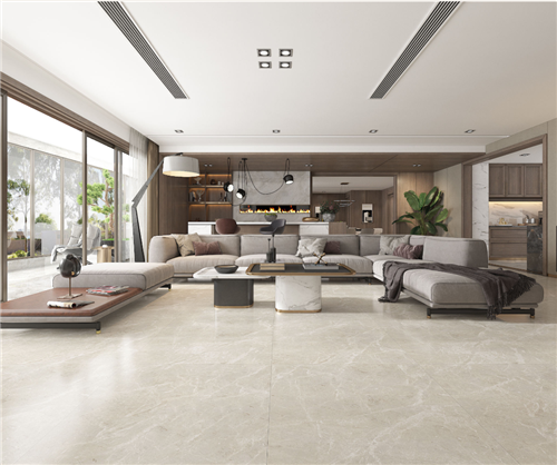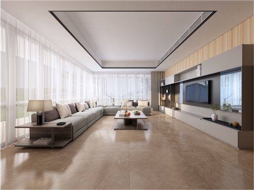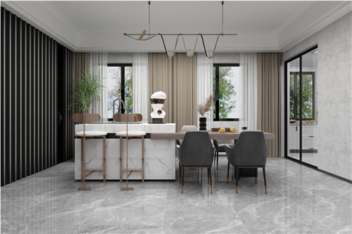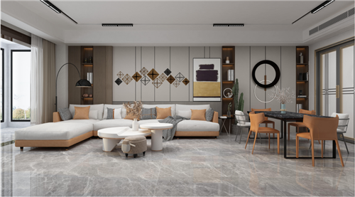 开放式客餐厅在地砖上可以选用一种比较随和的色彩作为搭配,暖灰色调的地砖纹理犹如流水般的灵动,与亮色沙发做搭配,让空间瞬间有了暖度,并有质朴的氛围。