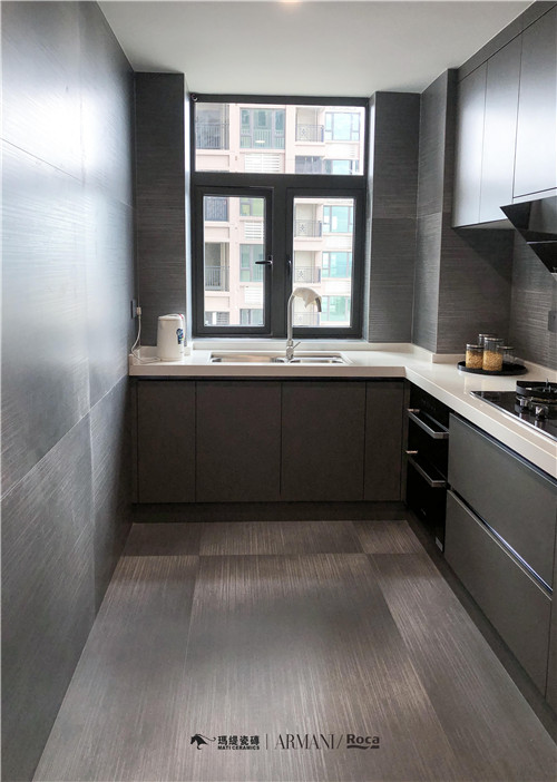烟灰为底,光感流动,金属银丝无规律镶嵌,碎了满室的浪漫与质感。仿佛就能在简约洗练的空间中,捉住时光短暂搁浅的灵动多变。令人在厨房这个最是人间烟火之处,享受精致生活的舒怡。