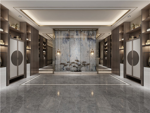 灰调柔和而平静,看似单调,实则丰富。原木材质墙柜自带一种古朴美,地面铺贴「埃及灰」不仅能其相谐,更增添了视觉上的灵动感,再搭配艺术感强烈的「梦中水乡」背景墙,整个空间营造出一种独特的气质美。