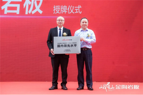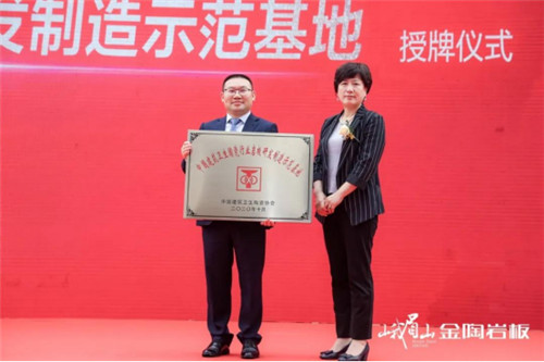 峨眉山金陶始建于2000年4月,已栉风沐雨二十一载,二十一年来不忘初心,不断发展,春风化雨谱写一首首壮丽诗篇。特别是在岩板时代的风口,峨眉山不断创新,一路巅峰领越,从台面板到家居板再到更多的跨界领域,从对岩板的探索、研发、制造和销售业绩,得到了中国建筑卫生陶瓷协会、广东陶瓷协会的权威认可和充分肯定。分别授予峨眉山金陶“中国岩板研发制造示范基地”和“数码雕釉大规格超薄(3.0mm)陶瓷岩板国内领先水平”的荣誉并现场进行授牌。
