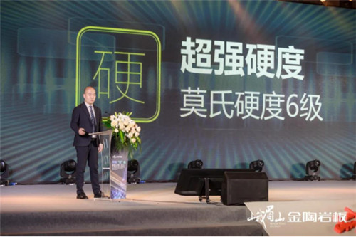 佛山市陶瓷行业协会秘书长、华南理工大学教授尹虹博士讲话,表示峨眉山金陶“2.5mm芯薄”岩板的全球发布和佛山总部4000㎡全岩板展厅的成功落成,标志着我们岩板作为一种新型材料朝着更薄、更轻、更节能环保的方向发展,也标志着岩板产品跨界新时代的到来。