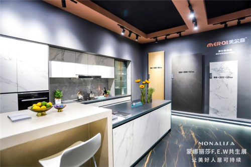 岩板这一物种是建陶行业经过三十余年沉淀迭代诞生的产物,它拥有优越的物理性能和可塑性,加上它无甲醛、低辐射自带绿色标签,成为当下及未来家居空间塑造的理想材料。2021年,蒙娜丽莎在岩板领域持续发力,推出美尔奇岩板品牌,在定制岩板、成品家具岩板、家电岩板的基础上,细分出“建筑岩板”品类,通过建立完善的岩板规格系统,从而实现覆盖墙地面装饰背景墙、橱柜台面定制等家居及商业空间全场景应用。在此次展位上,美尔奇连纹薄岩板(2400×1200×5.5mm)、室内墙地板(2700×800×10.5mm)以及室内墙地面(810×2010×5.5mm)、家具台面(760×2550×13.5mm)等多种规格产品配套成熟的岩板成品家具,演绎岩板高端定制空间。