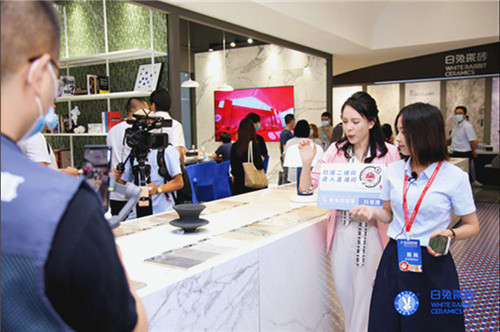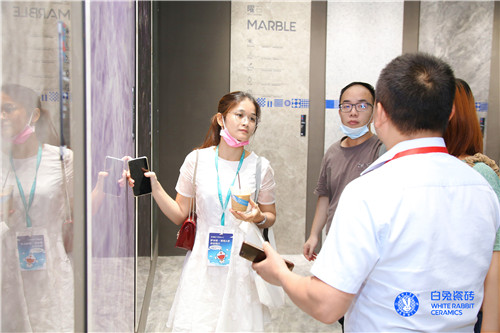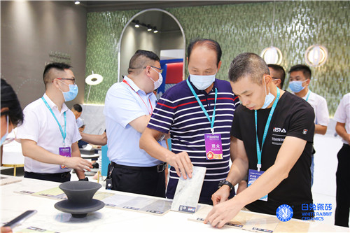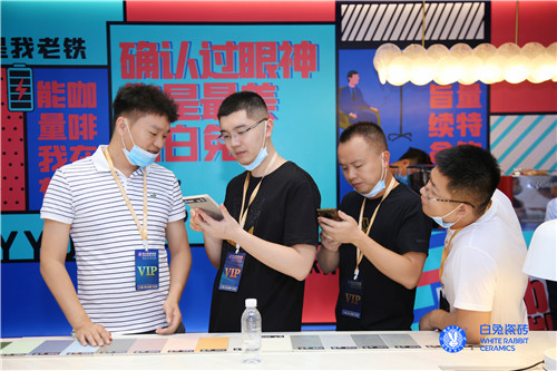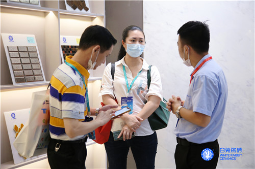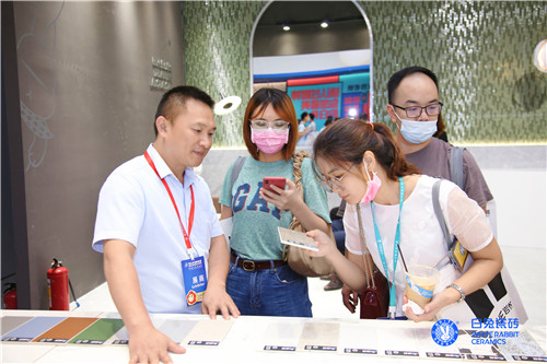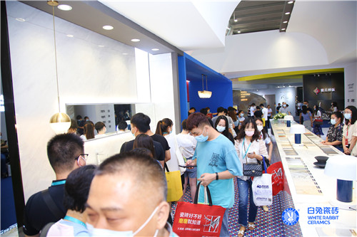 白兔瓷砖展位内外人头攒动,客如云集。