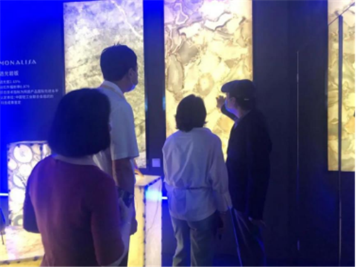 参观期间,蒙娜丽莎集团董事、副总裁邓啟棠向杨国强主席介绍了蒙娜丽莎岩板产品在多场景多领域应用中卓越的表现力。杨国强主席一行细心聆听工作人员的介绍,不时驻足观看,用手触摸体验蒙娜丽莎岩板产品质感、逼真的纹理和丰富的花色。展位现场,蒙娜丽莎自主研发的第三代3.5mm透光岩板也引发了杨主席的关注,并就其工艺、薄度、抗菌功能等问题进行现场询问,不禁为蒙娜丽莎的研发创新点赞。