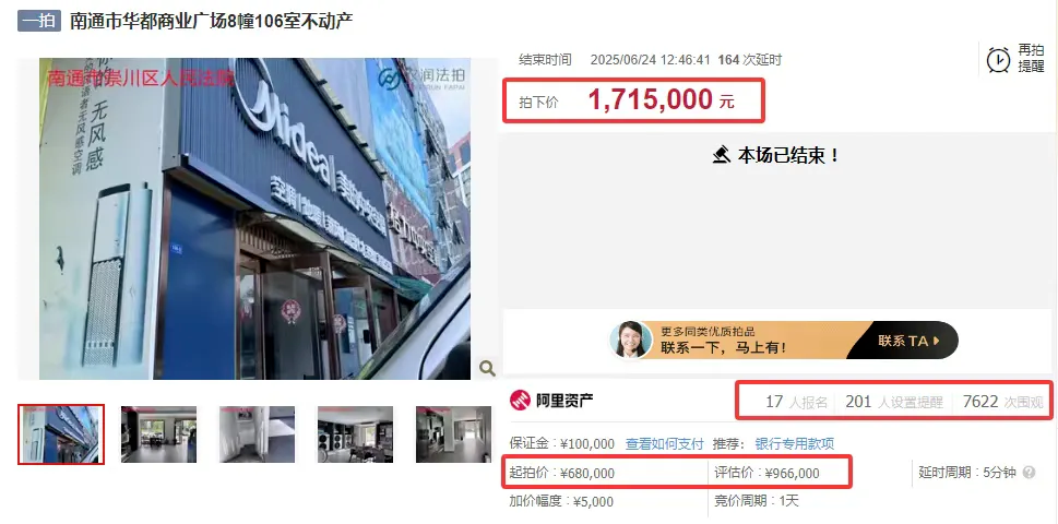 7月初,位于南通市濠西路288号华都商业广场的多套商办资产成功拍卖,成交总额超千万元。其中一套122.35平方米的不动产经过173轮激烈竞价,最终以171.5万元成交,溢价率高达152%,引发市场广泛关注。