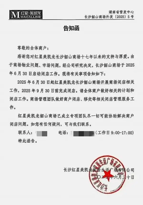 6月30日,长沙红星美凯龙家居生活广场有限公司发布一份致全体商户的告知函,表示由于商场物业问题、市场问题,公司研究决定,长沙韶山商场于2025年6月30日启动闭店工作,2025年9月30日前完成闭店。商场管理团队将做好商户闭店、移交等相关闭店管理服务工作。目前,该商场已成立专项团队协助解决商户闭店问题。