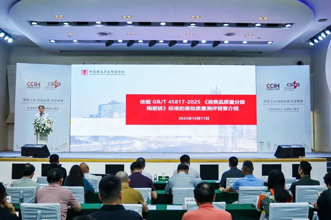 10月17日下午“2025建筑陶瓷新质生产力发展大会”佛山中国陶瓷产业总部基地隆重召开会议主要内容为GB/T 45817-2025《消费品质量分级 陶瓷砖》标准解读、依据GB/T 45817-2025《消费品质量分级 陶瓷砖》标准的首批质量测评结果公布及数据分析,以及建筑陶瓷新质生产力发展主题演讲。