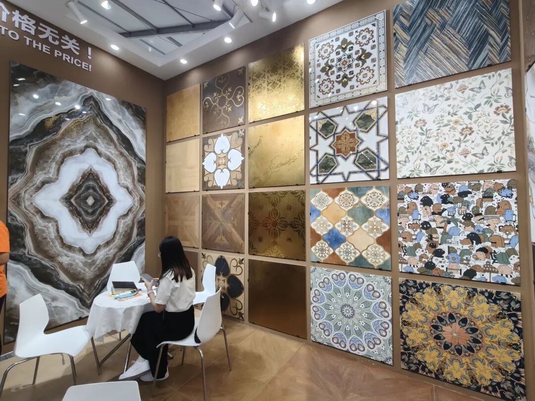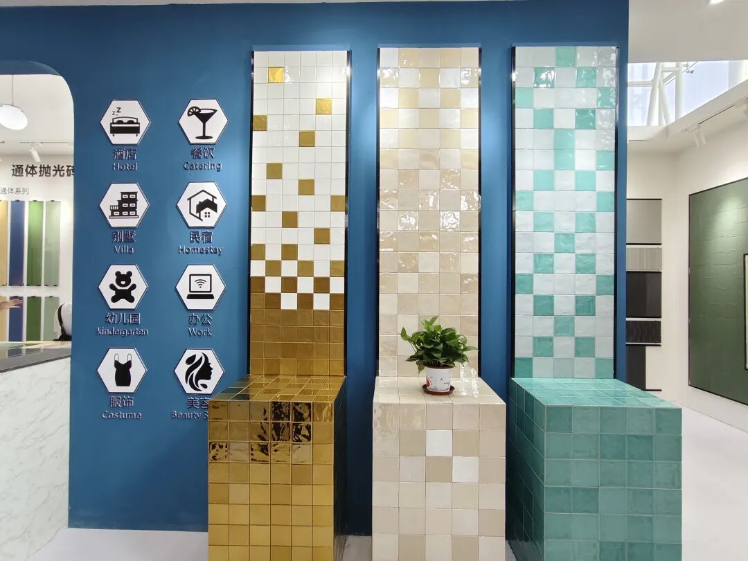 正之联展示了花砖系列、幸运花系列、古韵系列、渐变系列、马拉兹系列、纯色系列、洞石系列等多种款式的瓷片和马赛克瓷砖等,涵盖多种规格及3D凹凸面、电镀曲边等工艺的产品,从50×200mm迷你砖到900×1800mm大板,品类十分丰富且具有特色。