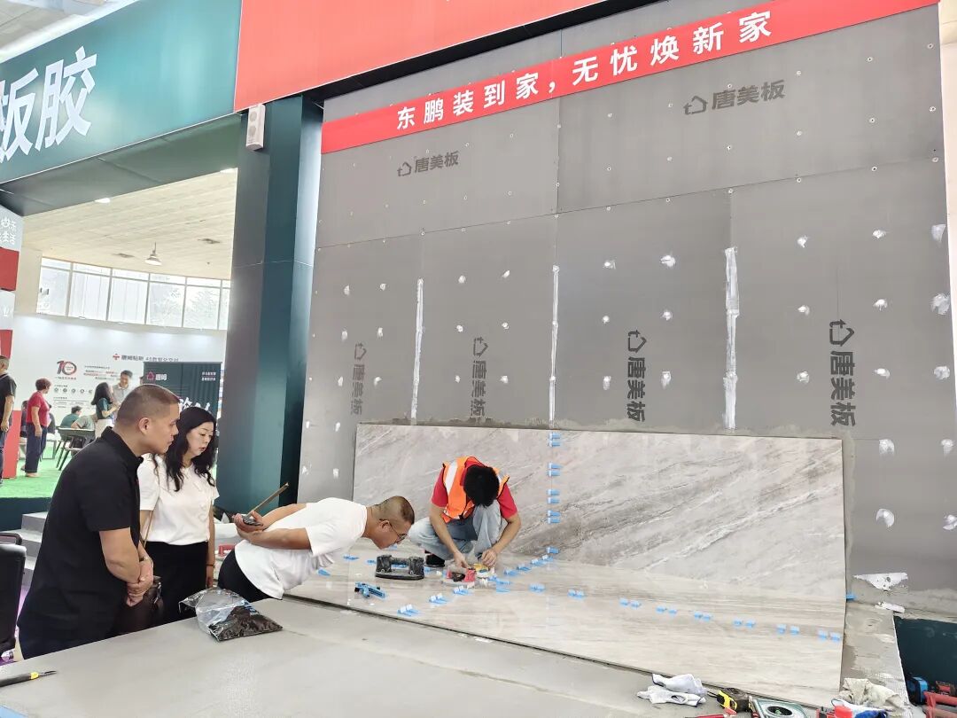 唐姆在E168展位特设了实景演示区,联合各行业头部品牌,现场展现规范化、标准化的岩板粘贴技术,让观众直观感受唐姆产品的实际应用效果,助力岩板/瓷砖铺贴技术的推广,直观呈现“好辅材+好工艺=完美交付”的一体化解决方案。