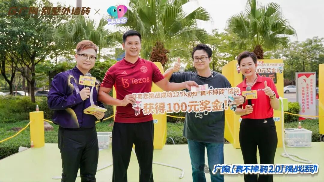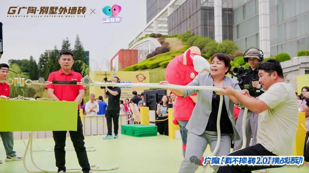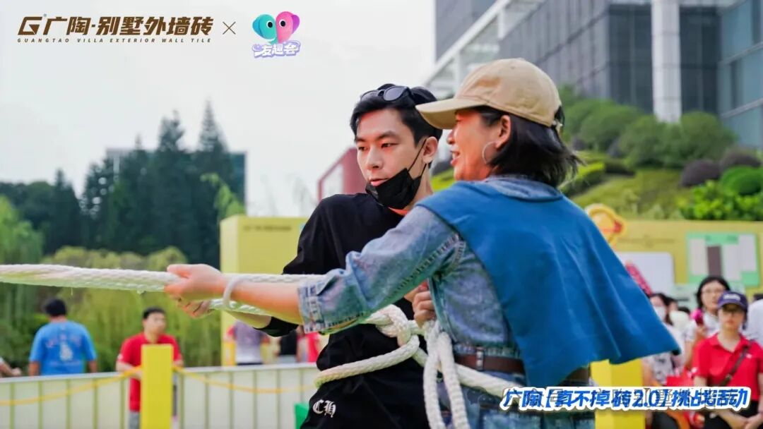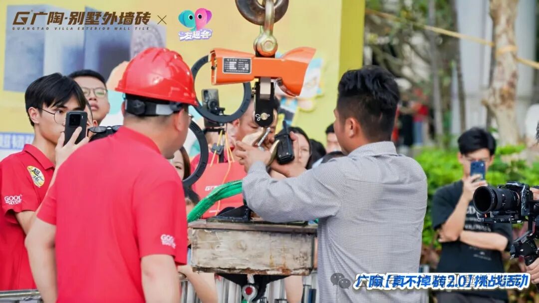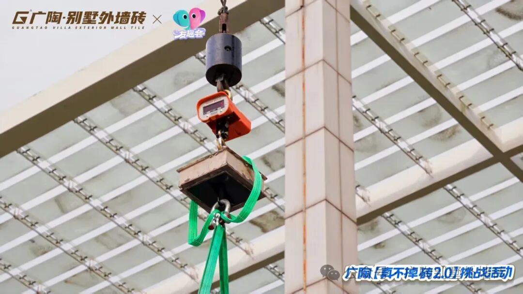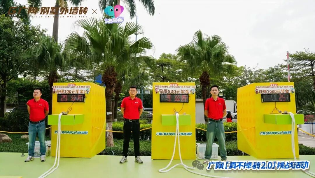 现场设置3组不同量级的拉力挑战装置,其中核心重磅的拉力试块,与吊车挑战所用的【广陶产品测试吊块】是完全一致的核心材质——模拟水泥墙+广陶超韧弹性瓷砖百粘胶+新国风五行1.0外墙砖。比赛时参与者两人一组,依次挑战进击不同量级,成功挑战者当场颁发对应奖励。活动时段分为三轮,每一轮都有主持人活力控场,组合搭档们默契协作、全力冲刺,全程氛围热烈。每一轮都非常精彩!