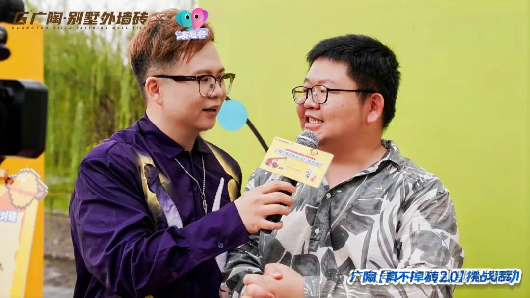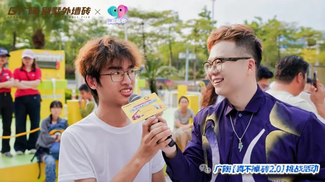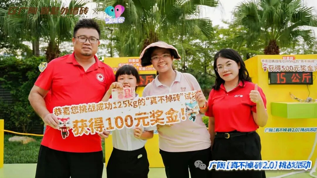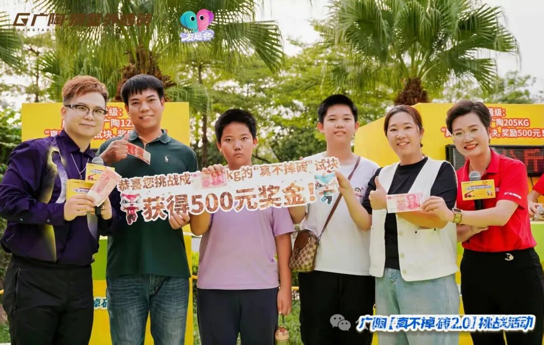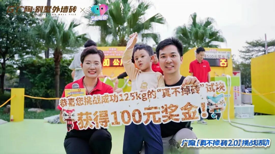 现场设置3组不同量级的拉力挑战装置,其中核心重磅的拉力试块,与吊车挑战所用的【广陶产品测试吊块】是完全一致的核心材质——模拟水泥墙+广陶超韧弹性瓷砖百粘胶+新国风五行1.0外墙砖。比赛时参与者两人一组,依次挑战进击不同量级,成功挑战者当场颁发对应奖励。活动时段分为三轮,每一轮都有主持人活力控场,组合搭档们默契协作、全力冲刺,全程氛围热烈。每一轮都非常精彩!