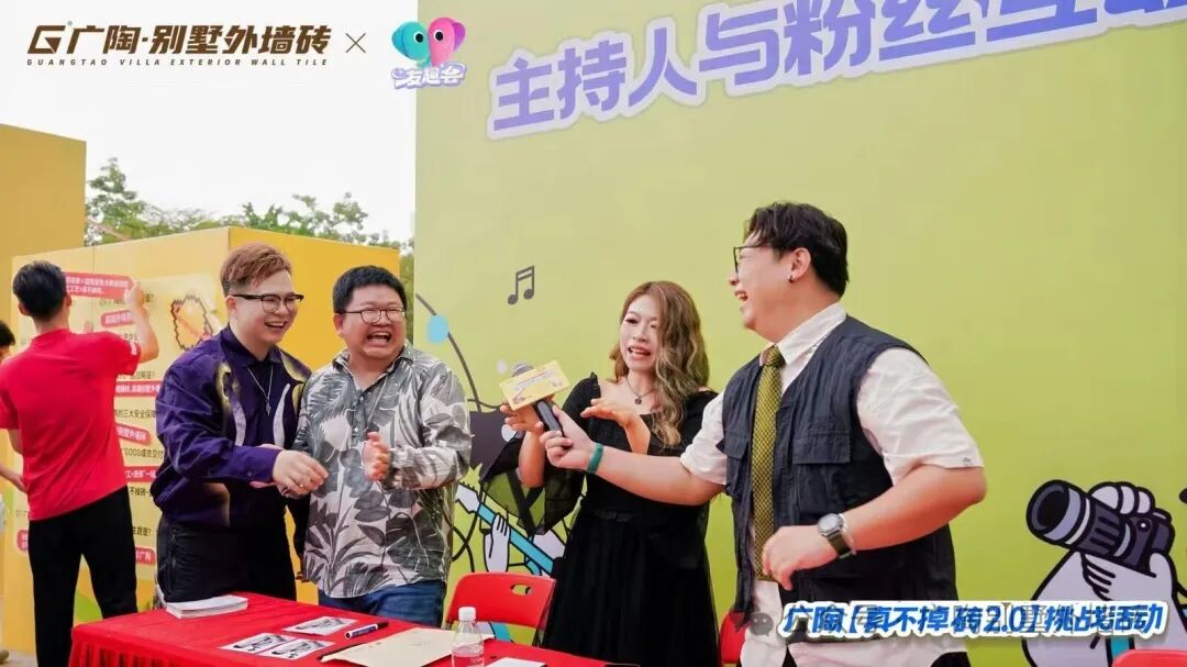本活动还特邀佛山电台知名主持人萧桦坚坐镇,全程讲解。更有资深行业媒体与优秀服务商代表全程直播加持!佛山+、醒目视频APP,醒目视频视频号、华夏陶瓷网、陶瓷信息、陶瓷资讯等数十家知名媒体进行现场全网直播,以及广陶官方抖音号、视频号,还有来自全国各地服务商代表也在现场全程直播挑战盛况。线上观众踊跃参与,线下嘉宾积极互动,双线联动、热闹非凡,全网超百万人通过直播共同鉴证这场全程高能、颠覆认知、重新定义外墙新高度的精彩活动。