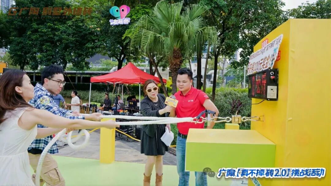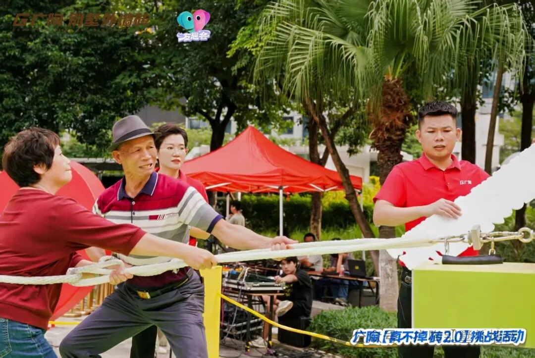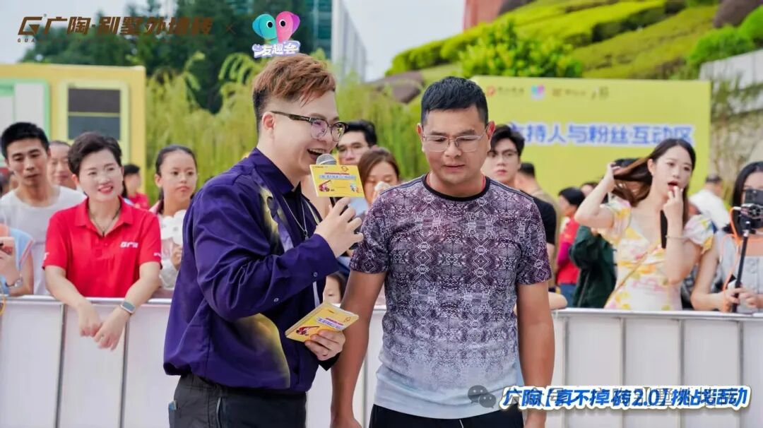 作为活动重磅环节,“爱情拉力赛”邀请现场观众搭档组队,合力拉动特制装置,配合大屏实时显示攀升的拉力数据,直观见证默契与力量的双重迸发,既获得协作乐趣,更能感受广陶超韧弹性瓷砖百粘胶的强悍抗拉力,全程趣味与爱意拉满~还有佛山传媒知名主持人——邵瑞云全程热情控场,观众们呐喊助威,热烈氛围吸引了大批市民驻足围观与参与!