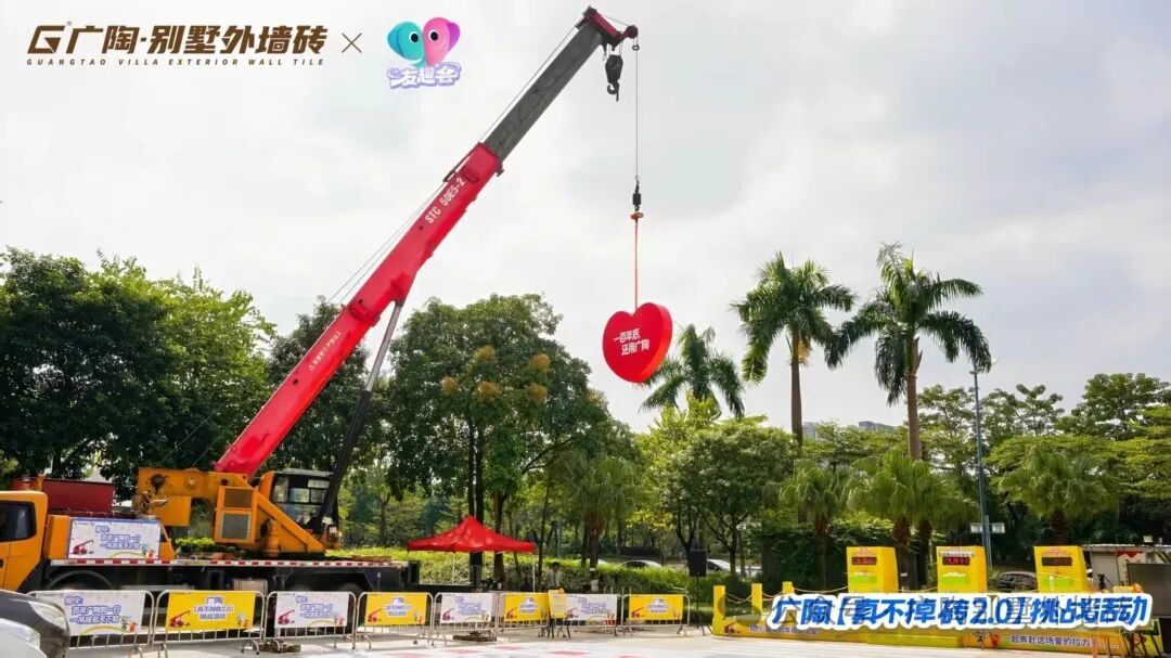 现场用大型吊车装置测试广陶超韧弹性瓷砖百粘胶的粘合力,观众可近距离观摩实验过程,还能在吊车直播打卡区拍照留念,感受广陶产品的硬核实力,凭此还可获得一次盖章。