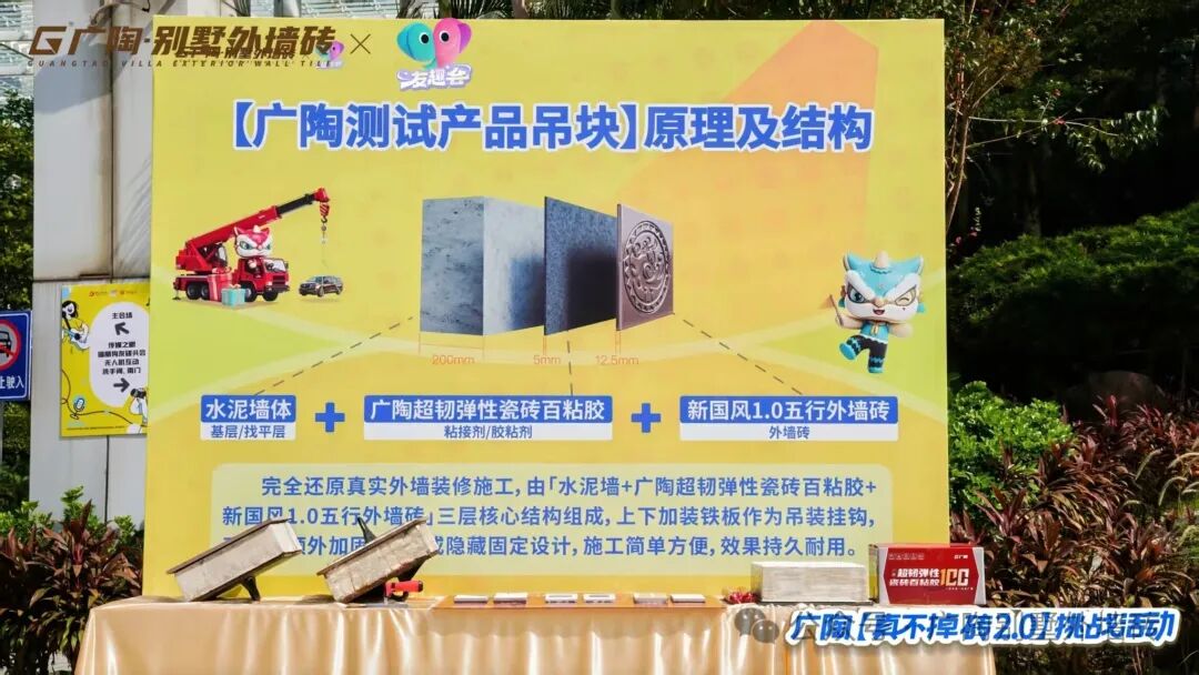【广陶产品测试吊块】由「水泥墙+广陶超韧弹性瓷砖百粘胶+新国风1.0五行外墙砖」三层核心结构组成,上下加装铁板作为吊装挂钩,无任何额外加固、卡扣或隐藏固定设计,施工简单方便,效果持久耐用。