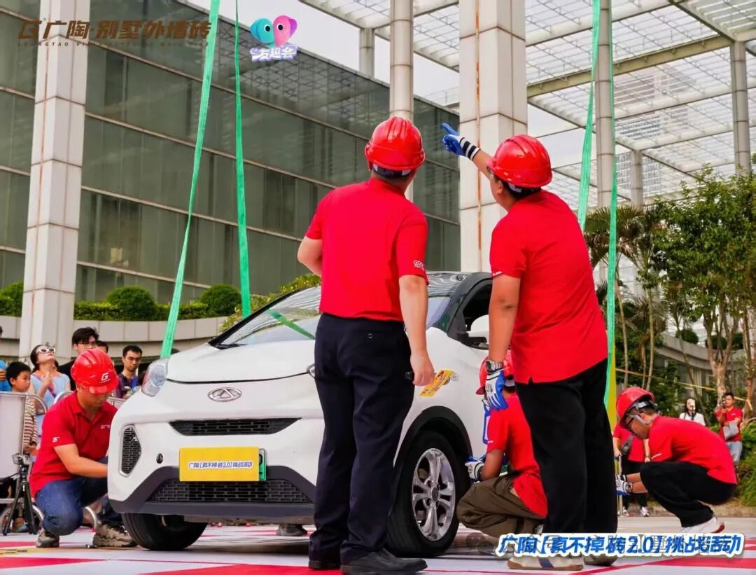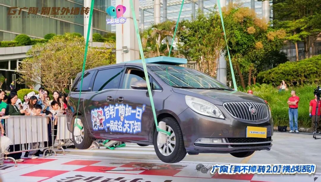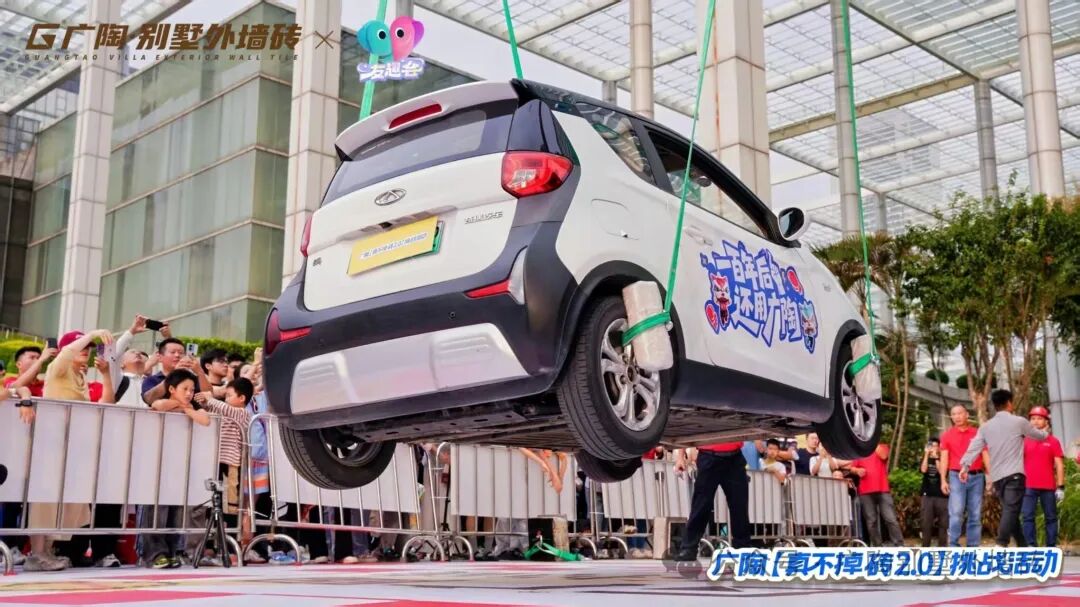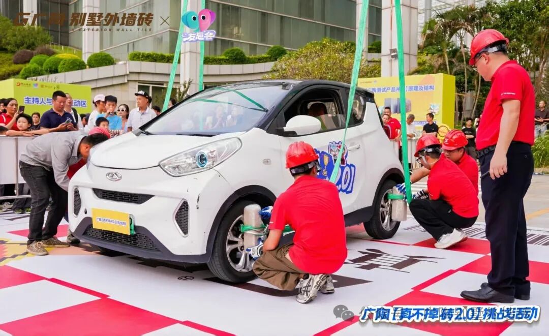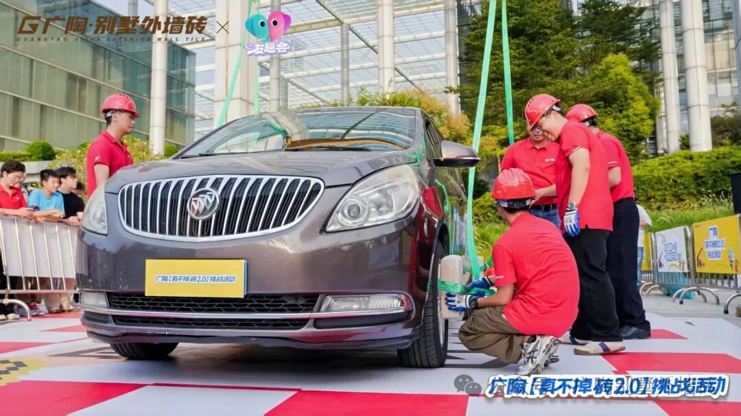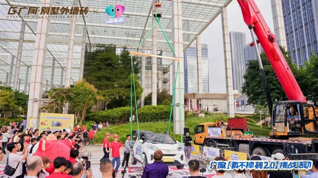 测试过程中,广陶400x400mm规格的新国风外墙砖先后接受了奇瑞小蚂蚁(约1000KG)、别克 GL8(约2000KG)的吊车测试。凭借广陶超韧弹性瓷砖百粘胶的超强粘结力,最终两辆车均成功挑战了【真不掉砖2.0】测试,都经受住了极限考验!现场也为市民展示、介绍试块的内部结构,进一步证实了试块的真实性与可靠性,彰显了广陶品牌对产品质量的坚定信心与不懈追求。