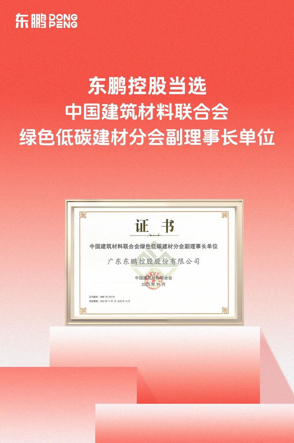 东鹏控股当选中国建筑材料联合会绿色低碳建材分会副理事长单位