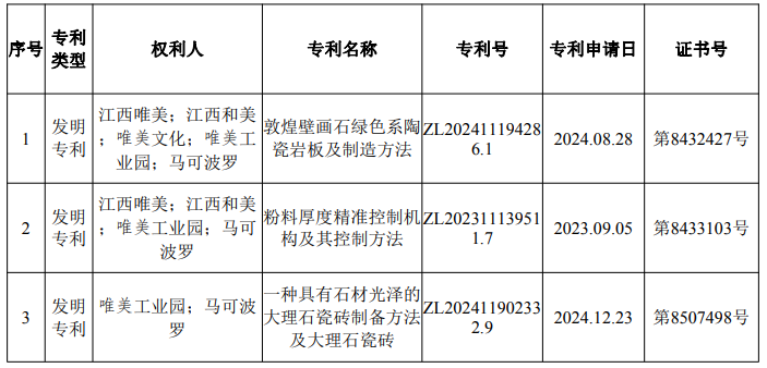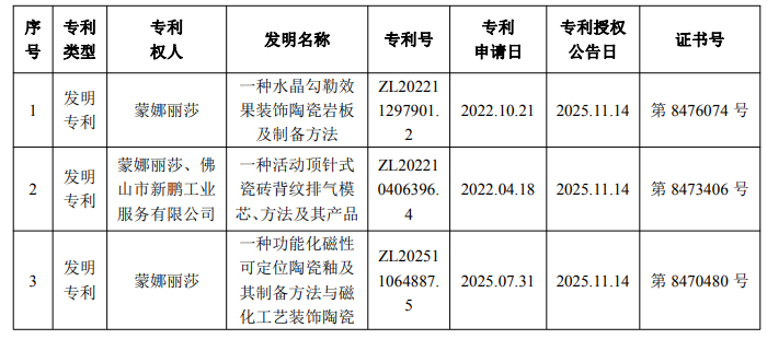 多项发明专利密集获批!蒙娜丽莎、东鹏、马可波罗、宏宇……