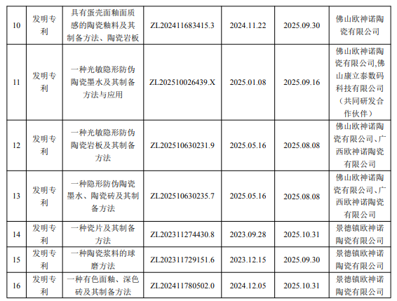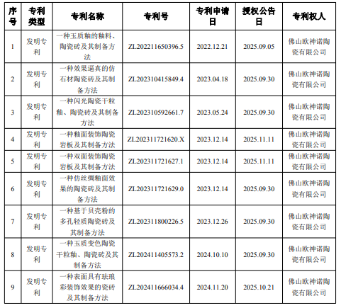 12月2日,帝欧水华发布公告称,公司下属子公司欧神诺陶瓷近日收到国家知识产权局颁发的16项发明专利证书。专利名称分别为:一种玉质釉的釉料、陶瓷砖及其制备方法;一种效果逼真的仿石材陶瓷砖及其制备方法;一种闪光陶瓷干粒釉、陶瓷砖及其制备方法;一种釉面装饰陶瓷岩板及其制备方法;一种双面装饰陶瓷岩板及其制备方法;一种仿丝绸釉面效果的陶瓷砖及其制备方法;一种基于贝壳粉的多孔轻质陶瓷砖及其制备方法;一种玉质变色陶瓷干粒釉、陶瓷砖及其制备方法;一种表面具有珐琅彩装饰效果的瓷砖及其制备方法;具有蛋壳面釉面质感的陶瓷釉料及其制备方法、陶瓷岩板;一种光敏隐形防伪陶瓷墨水及其制备方法与应用;一种光敏隐形防伪陶瓷岩板及其制备方法;一种隐形防伪陶瓷墨水、陶瓷砖及其制备方法;一种瓷片及其制备方法;一种陶瓷浆料的球磨方法;一种有色面釉、深色砖及其制备方法。