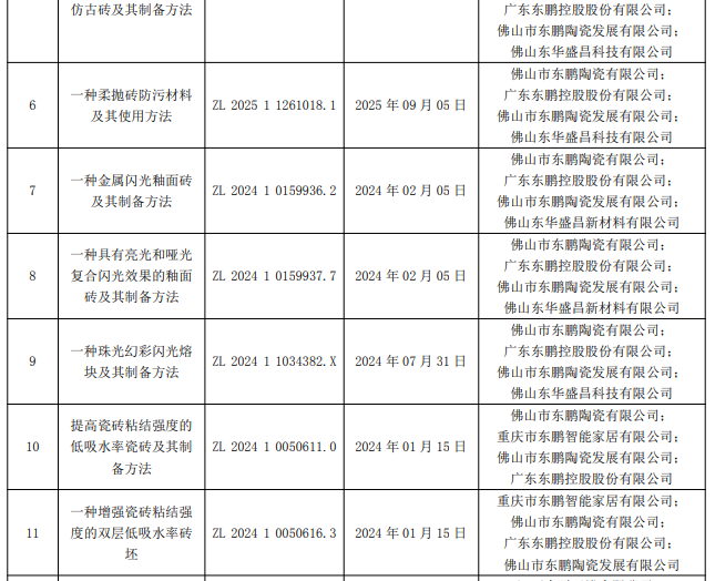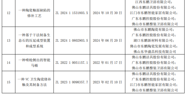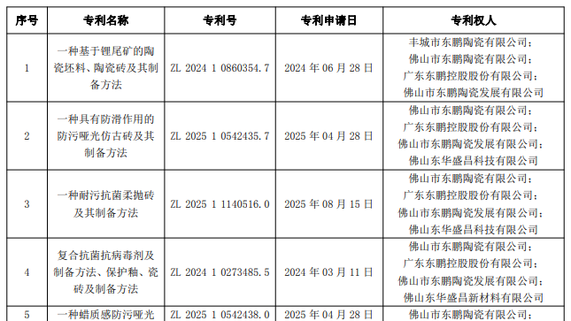 12月5日晚间,东鹏控股发布公告称,公司及控股公司于近日取得由国家知识产权局颁发的15项发明专利证书,涵盖锂尾矿应用于瓷砖生产的固废循环经济技术、防滑抗菌防污适老化瓷砖、智能马桶、生态石生产技术等,专利已应用或即将应用于生产,有利于保护自主知识产权、保持技术领先并提升核心竞争力。截至本公告披露日,东鹏控股及控股子公司累计共取得各类型专利2546项,现有各类型有效专利1328项。