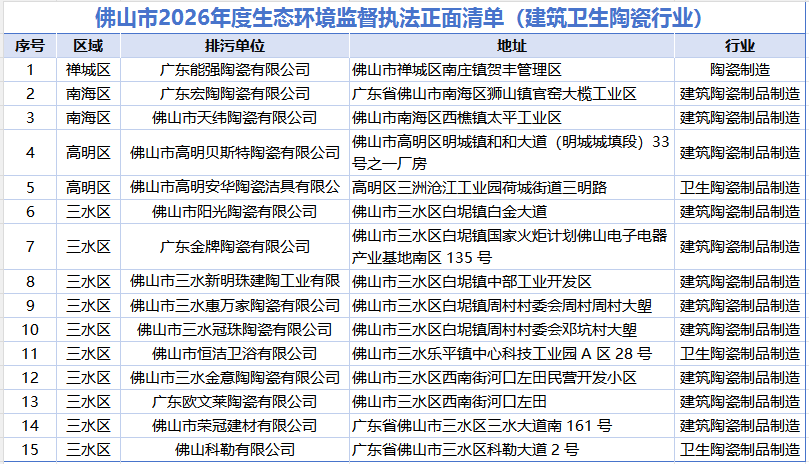 12月10日,佛山市生态环境局公布佛山市2026年度生态环境监督执法正面清单。据不完全统计,建筑卫生陶瓷行业有能强、宏陶、金牌、新明珠、金意陶、欧文莱、冠珠、安华、恒洁等15家企业满足条件并通过官方审核,进入该清单。