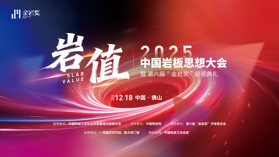 2025年12月18日,由中国陶瓷工业协会陶瓷幕墙与岩板分会指导、 主办的2025中国岩板思想大会暨第六届“金岩奖”颁奖典礼将以“岩值”为主题在佛山举行。集结号角已经吹响,“岩板人”即将再次齐聚中国陶瓷卫浴总部,共话“岩板价值”。