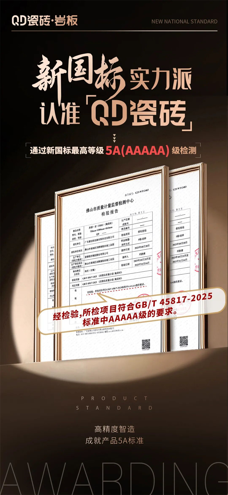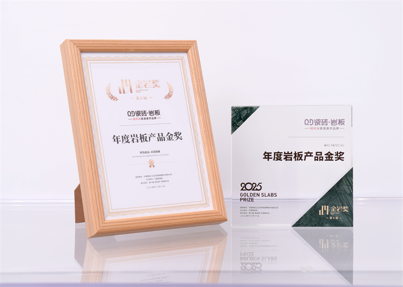 从“2025年度建筑卫生陶瓷十大品牌榜·陶瓷一线品牌”的全面肯定,到“金岩奖·年度产品金奖”殊荣的专业聚焦,QD以独特的美学、先进的技术和可量化、可感知的“5A级品质”体系,在岩板的价值深水区树立了鲜明的旗帜。
