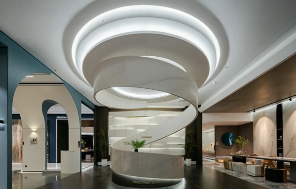 在岩板产品方面,马可波罗自主研发的曲面岩板率先在行业内实现高弯曲度弧形板的生产,厚度仅有6毫米。这款创新产品荣获2024年IF设计奖,标志着国际设计界对中国瓷砖品牌在材质创新、空间美学与科技实力上的高度认可。
