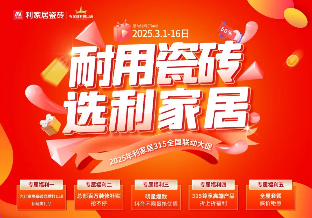 3月,利家居瓷砖以「耐用瓷砖,选利家居」为主题,开展为期16天的“2025年利家居315全国联动大促”活动。此次钜惠精准触达全国,各终端门店热烈响应,捷报连连,热情如火,业绩再攀新高峰。