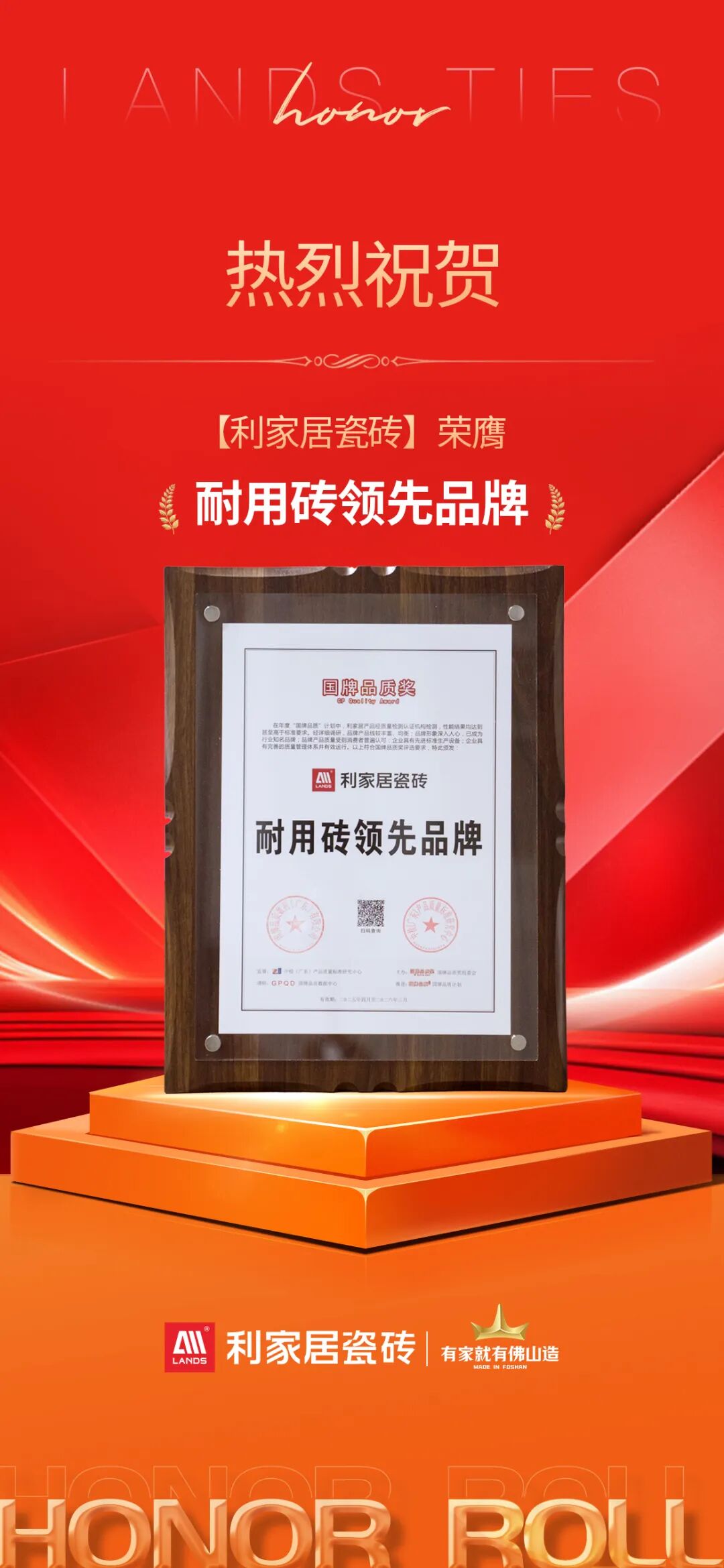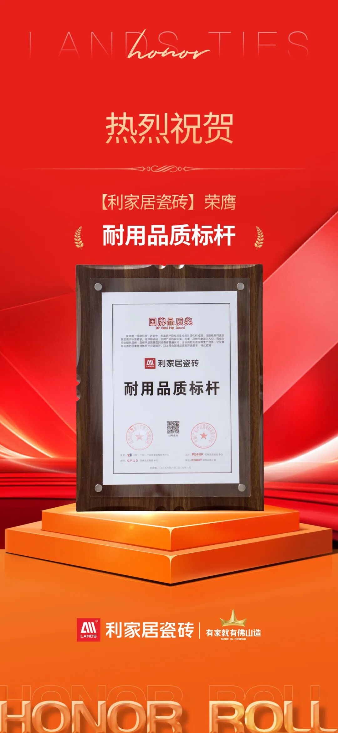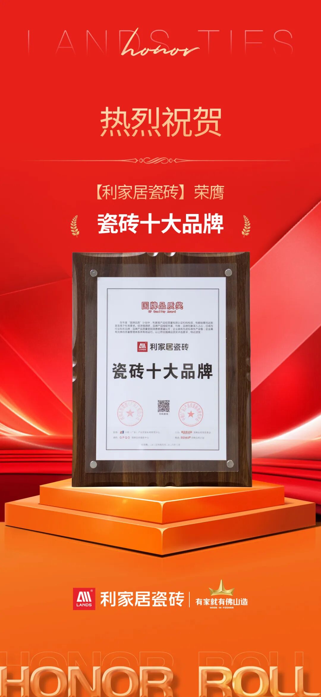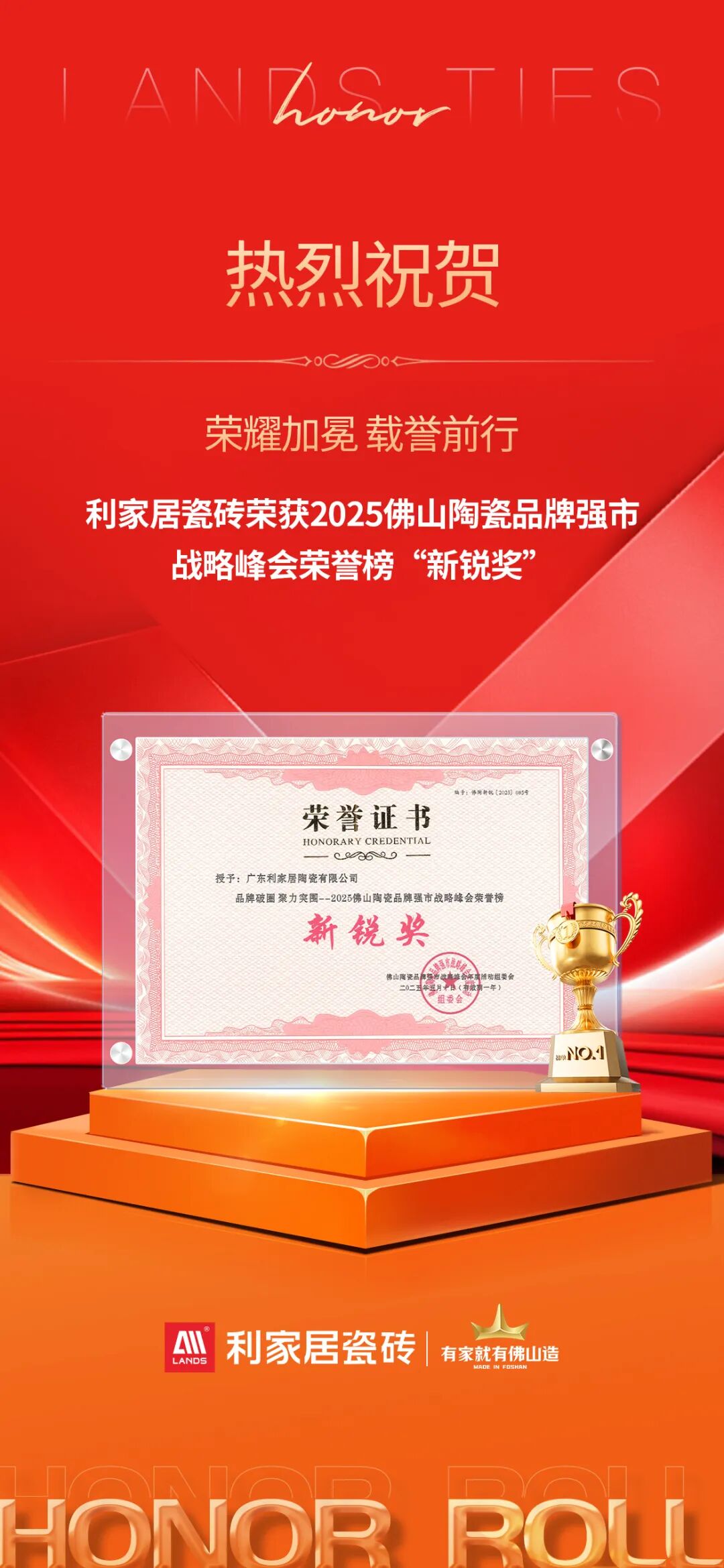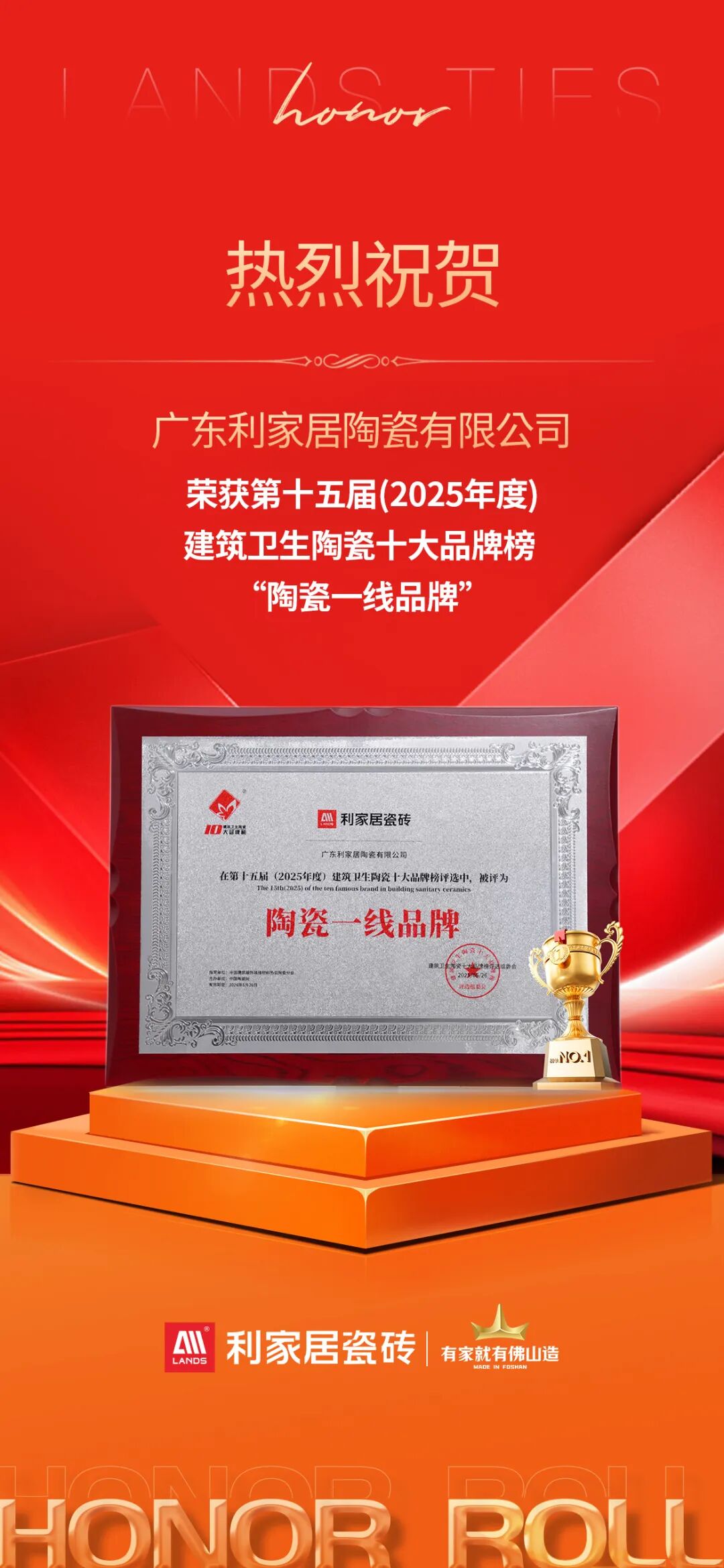 5月,利家居瓷砖荣获2025佛山陶瓷品牌强市战略峰会荣誉榜“新锐奖”及荣获第十五届(2025年度)建筑卫生陶瓷十大品牌榜 “陶瓷一线品牌”。