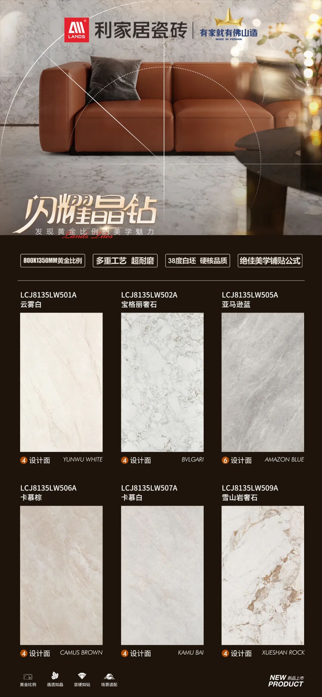 重磅新品上市 | 利家居「闪耀晶钻」系列,800x1350mm规格,定义空间新美学!坚硬如钻,通透如晶,光感如钻,奢雅天成,接近0.618黄金分割,适配多种空间场景;5层工艺结构:防污耐磨、霓虹幻彩,纳米防污釉层实现0.05%超低吸水率;动态光学美学:多角度晶体折射,呈现七彩悬浮光影效果。