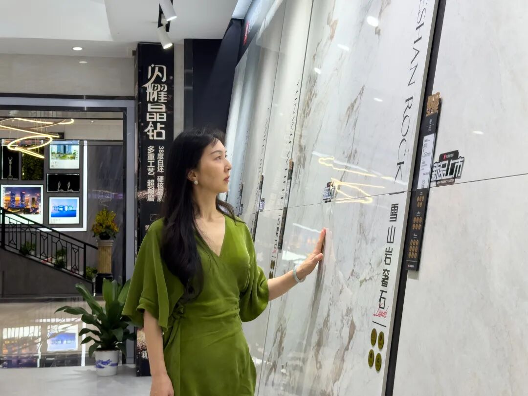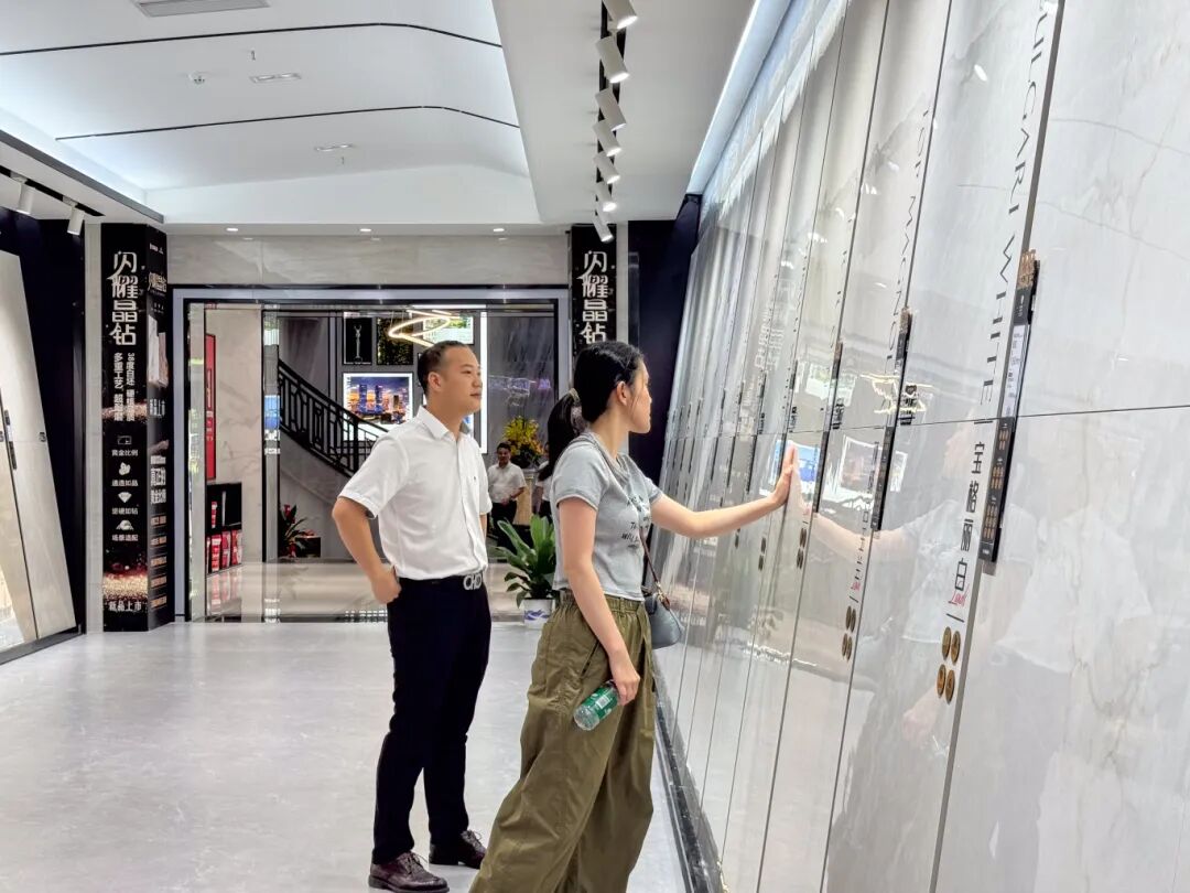 设计师们驻足「闪耀晶钻系列」展区,指尖轻触瓷砖表面,一场关于材质与美学的对话悄然展开。