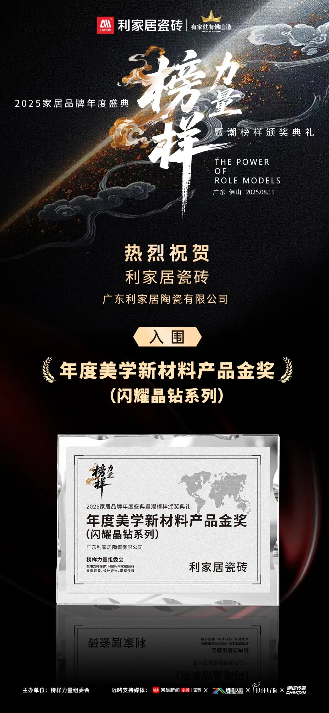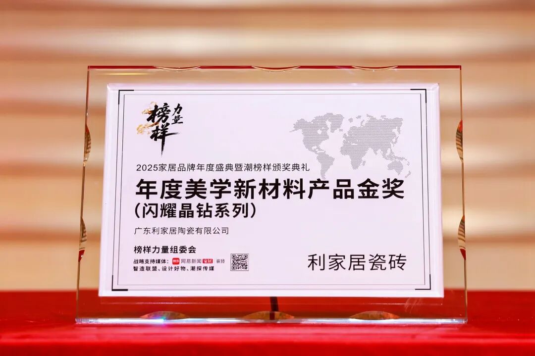 广东利家居陶瓷有限公司凭借其卓越的创新实力与对美学的不懈追求,荣获“年度美学新材料产品金奖”(闪耀晶钻系列),绽放品牌之光,释放榜样之声!