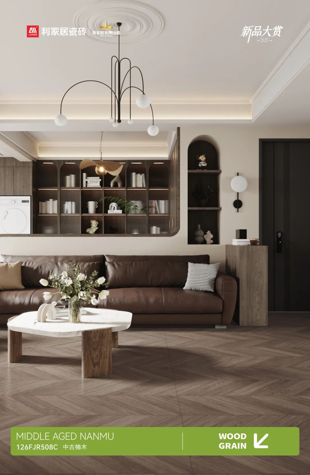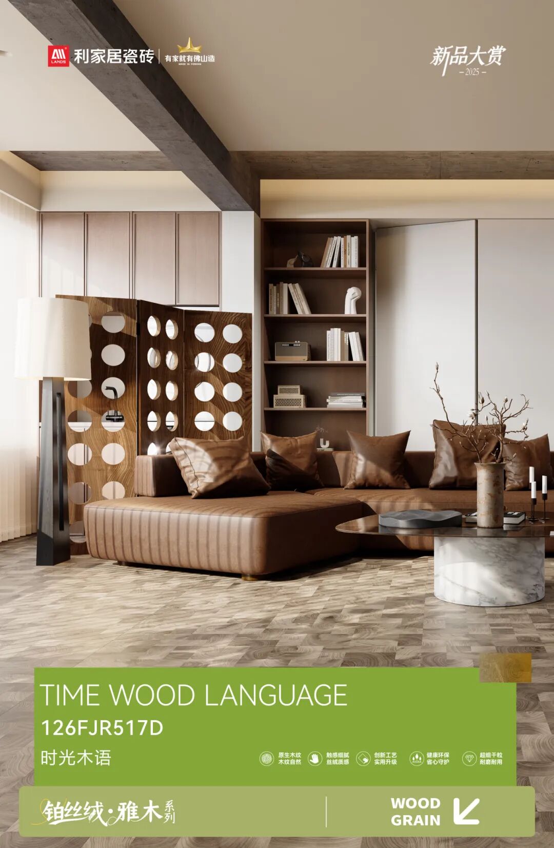 利家居木纹系列600×1200mm,铂丝绒雅木系列新品上市,表面细腻丝绒触感,将自然树木的肌理脉络,转化为可触摸的艺术语言,既保留了原木的温润呼吸感。质感高级:亲肤丝绒釉感,性能卓越:经久耐磨抗污工艺升级:比传统木纹砖更好,微光护眼:实用主义升级,格调非凡:鱼骨艺术拼接。