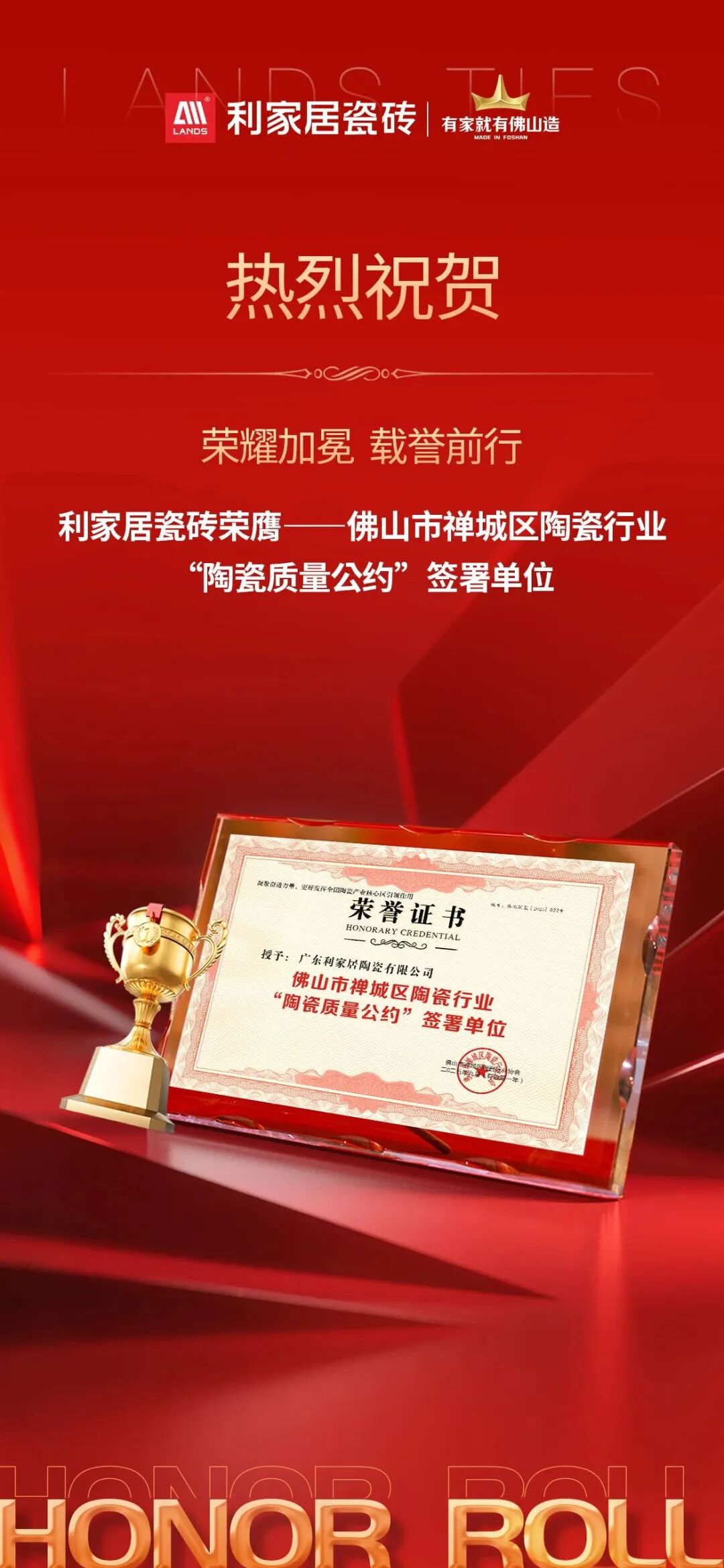 热烈祝贺利家居瓷砖荣膺,佛山市禅城区陶瓷行业——“陶瓷质量公约”签署单位。