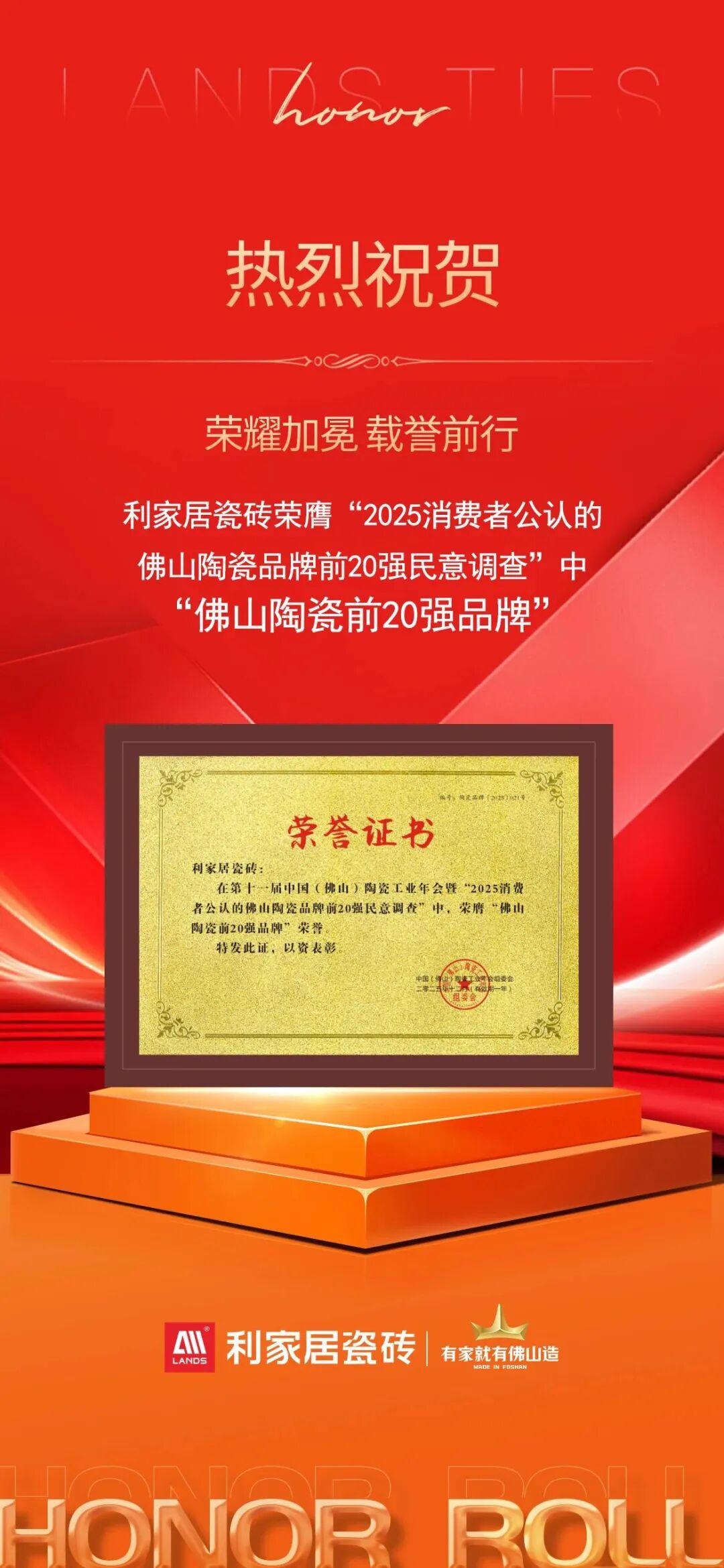 喜讯 | 热烈祝贺利家居瓷砖荣膺——“2025消费者公认的佛山陶瓷品牌前20强民意调查”中“佛山陶瓷前20强品牌”。