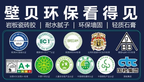 壁贝产品通过了欧洲 Eurofins IAC[金级]认证、德国GEV EMICODE[EC1PLUS]级认证、英国BREEAM标准、德国AgBB VOC标准、中国十环认证等十项国内外权威环保认证。