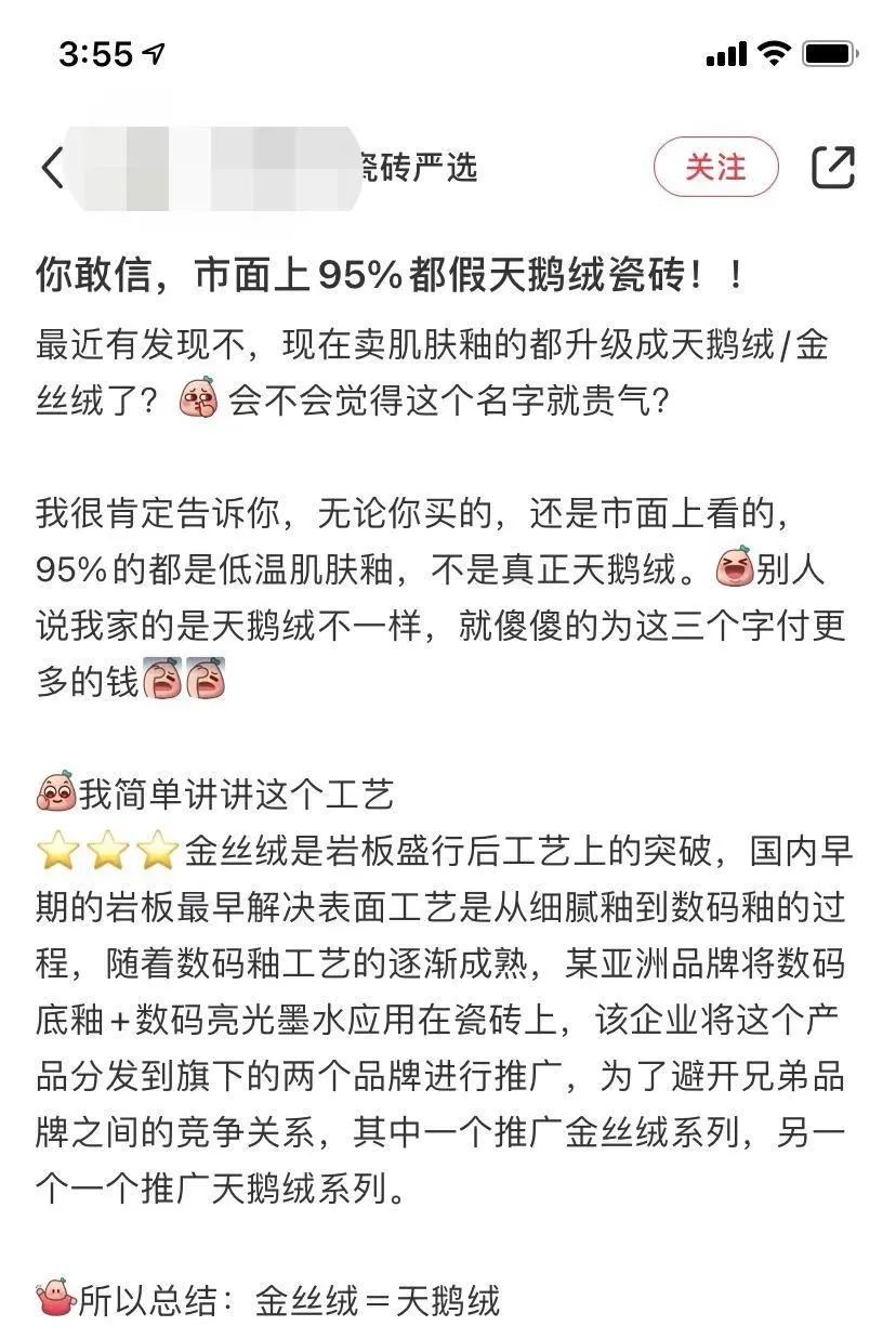然而,由于目前行业对天鹅绒没有统一的生产标准,市场上出现了把原来的肌肤釉换了名字和包装“鱼目混珠”的现象,更有博主声称“市面上95%都是假天鹅绒瓷砖”!