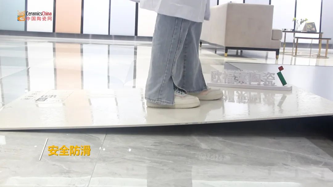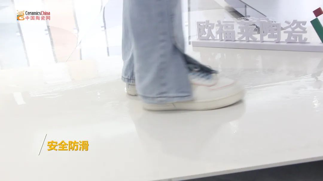 哑面的设计面不仅增加了欧福莱岩板瓷砖整体的奢华感和高级感,还大大提升了其防滑性。测评人员首先倒水淋湿倾斜的产品表面,再走上去,上下走动并无下滑迹象;之后,测评人员脚踩在产品表面上下摩擦,摩擦中其能感觉到有一股很大阻力。实验结果表明,该岩板瓷砖防滑效果非常出众,非常适合厨卫空间及有老人小孩的家庭。