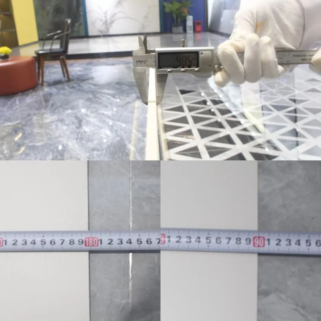 经过大吨位压机压制的欧福莱岩板瓷砖,不仅性能更优越,其表面平整度也相当出色。测评人员使用0.06mm的塞尺去测试产品与水平尺之间的缝隙,发现根本无法塞入,证明其在生产过程中平整度控制得非常好。