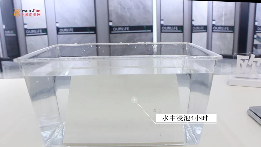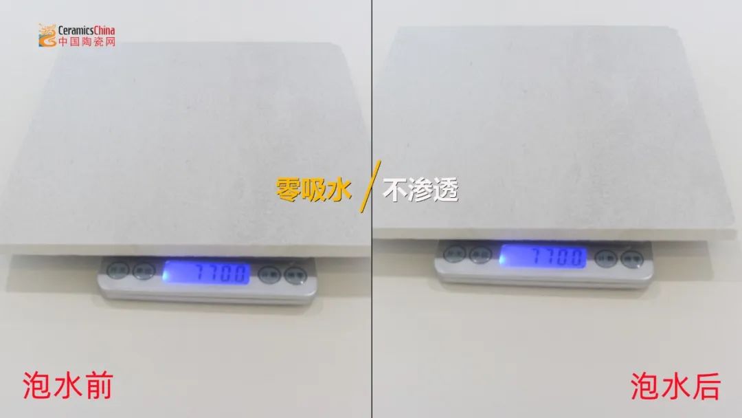 一般来说,现在普通瓷砖的吸水率已经可以达到很低的0.1%,然而作为瓷砖的升级版,欧福莱岩板瓷砖的吸水率更甚,可以实现双零吸水。实验中,测评人员首先将小片样品承重,记录数据;再将其放进水里,完全侵泡4个小时;最后将其取出吸干表面水分,重新称量其重量。发现前后重量数据没有变化,说明该岩板瓷砖吸水率极低。这种“不吸水”的性能意味着该岩板瓷砖非常适合应用于厨卫、阳台等经常潮湿的空间,使用久了也不会发黄发霉。