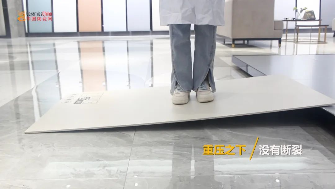 欧福莱岩板瓷砖的厚度为9mm,相较于普通瓷砖的10-12mm较薄了些,但是其抗折性能依旧强大。测评人员站上倾斜的产品表面,随后上下摇晃,产品也没有出现断裂的现象,说明其承重能力相当强大。