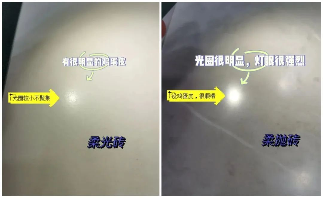 因此,消费者在选购柔光砖时一定要辨别清楚,不要买到柔抛砖。在这里,中陶君分享一个辨别柔光砖和柔抛砖的方法:用强光照射,观察瓷砖表面光圈大小。如果光圈较小且不集中不刺眼,表面有类似于鸡蛋皮的质感,说明是柔光砖;光圈很刺眼且表面顺滑光亮,说明是柔抛砖。