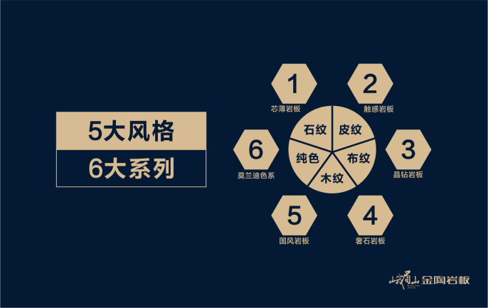 峨眉山金陶拥有皮纹、布纹、木纹、石纹、纯色5大风格的6大系列产品,分别为芯薄岩板、触感岩板、晶钻岩板、莫兰迪色系岩板、奢石岩板、国风岩板等。规格覆盖600*1200至1200*3000等20种规格,七种厚度(2.5、3、6、9、12、15、20mm),丰富的产品花色达1000余种。能满足不同消费者的个性化需求。目前是国内规格厚度最全的中国岩板研发制造引领型企业。