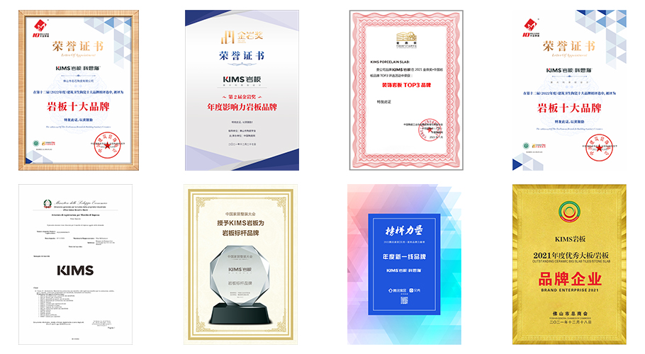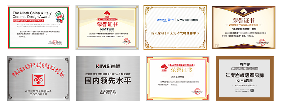 KIMS近年来先后荣获”岩板研发制造示范基地”“中意设计大赛创新奖”、“岩板十大品牌”、“岩板标杆品牌”、最新研发的岩板新品荣获“岩板产品金奖”和“岩板应用金奖”等殊荣。